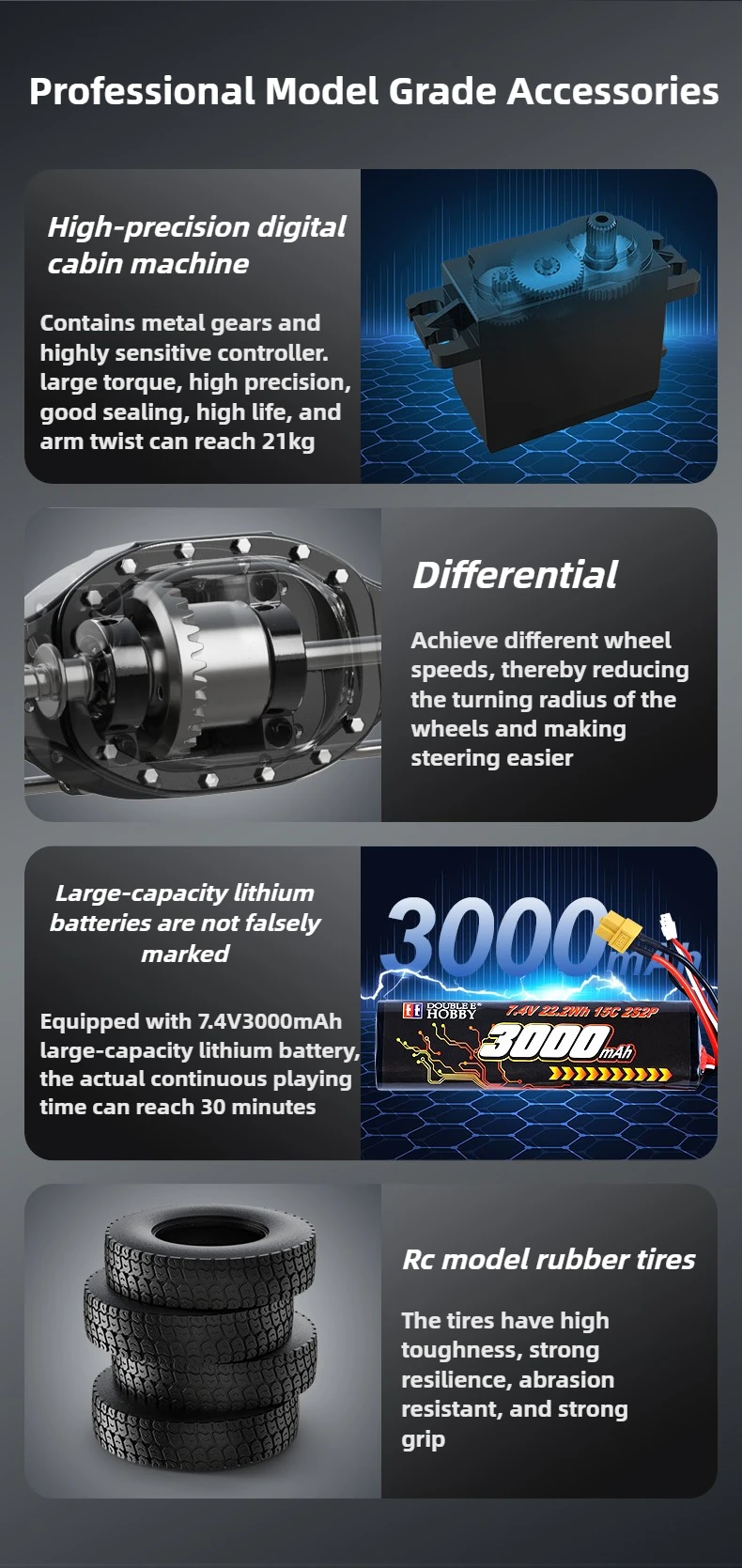 All-metal gear drivetrain, stainless steel drive shafts, and aluminum alloy chassis girders